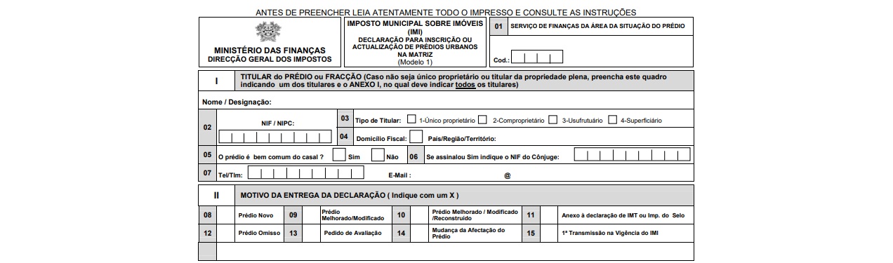 O Modelo 1 do IMI é a declaração usada perante a Autoridade Tributária para comunicar a inscrição ou atualização de prédios urbanos na matriz. No próprio formulário oficial, a AT identifica-o como “Declaração para inscrição ou atualização de prédios urbanos na matriz”.