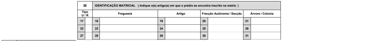 No campo 01, deve indicar o código e o nome do Serviço de Finanças da área da situação do prédio. Não é o serviço da sua residência, mas sim o serviço correspondente ao local onde o imóvel se situa.