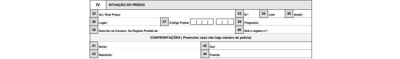 No Quadro IV, preenche-se a morada, o código postal, a freguesia e os elementos de registo predial. As confrontações só precisam ser preenchidas quando o prédio não tem número de polícia.