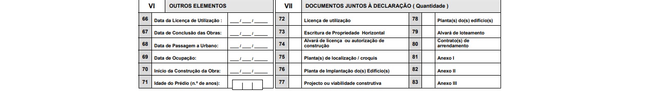 O quadro VII é muito prático: serve para indicar que documentos acompanham o Modelo 1. O impresso oficial enumera vários exemplos, como licença de utilização, escritura de propriedade horizontal, plantas, alvarás e anexos.