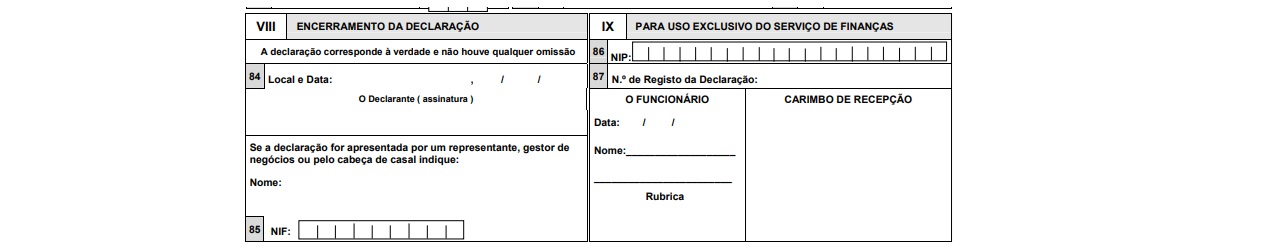 Por fim, chega-se ao encerramento. É neste quadro que o declarante confirma a veracidade da informação, indica local e data e assina a declaração. O formulário prevê ainda a identificação de representante, gestor de negócios ou cabeça de casal, quando a entrega não é feita diretamente pelo titular.